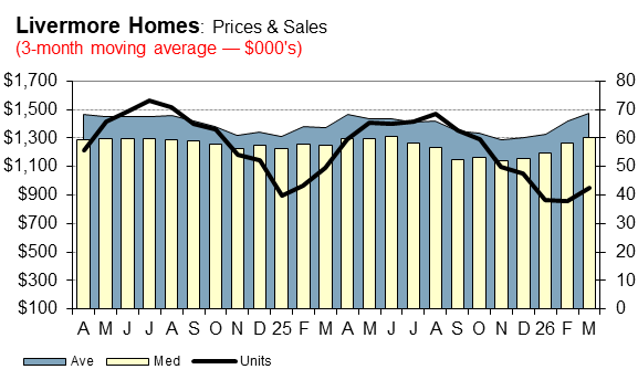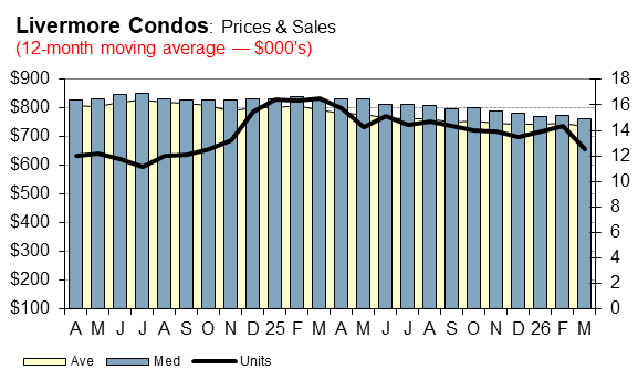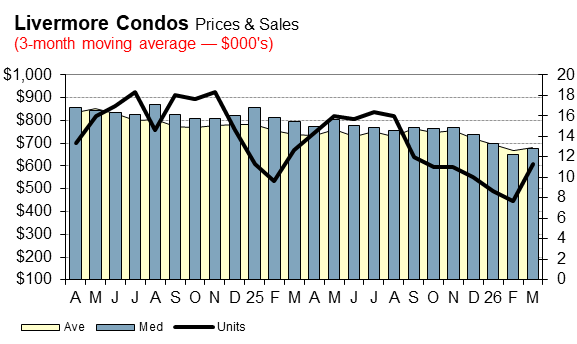 The following charts shows median and average price trends plus sales for single-family homes and condos. The chart uses a 3-month moving average to smooth out month-to-month fluctuations yet retain seasonal variations.